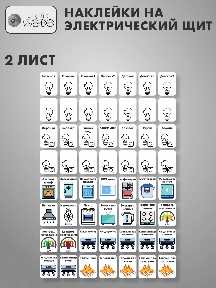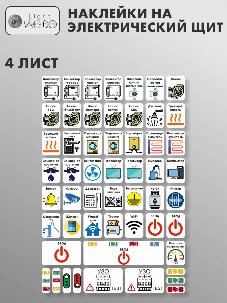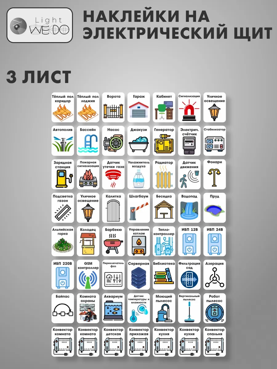 Набор наклеек для подписи и маркировки позволяют легко различать автоматы и группы. Ярлыки для проводки и бирка для автоматов делают обслуживание электрический шкаф и распределительный щит безопасным и быстрым. Этикетки помогают электрику, мастеру или владельцу дома моментально найти нужную линию. Наклейки для электрощитка из плотной плёнки устойчивы к влаге, их можно приклеить на выключатель и розетки, распределительный шкаф, щит управления или силовой шкаф.