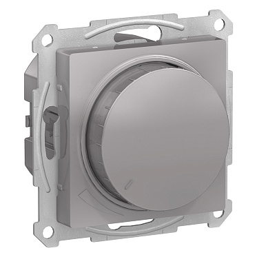 Механизм светорегулятора Systeme Electric (ранее Schneider Electric) серии AtlasDesign (цвет алюминий) поворотно-нажимной для нагрузки мощностью до 400 Вт, подходит для LED ламп.