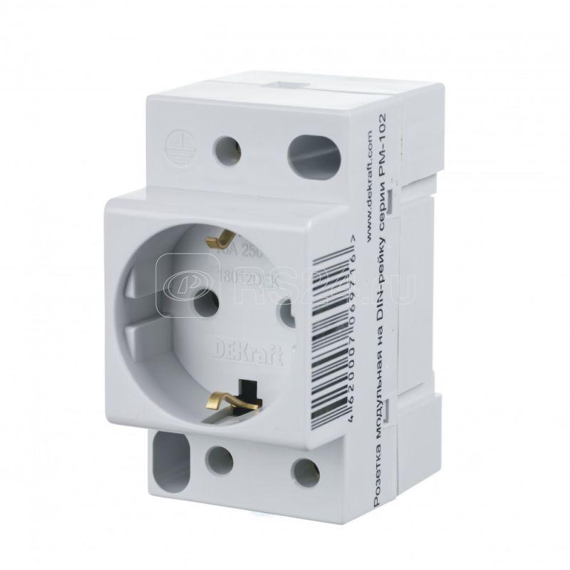 Розетка модульная серии РМ-102 DEKraft; ном.ток – 16 А; с заземляющим контактом; ширина – 45 мм; установка – на DIN-рейку; установочное положение – любое; степень защиты – IP20. Розетка модульные предназначены служит для подключения переносных светильников или электрического инструмента малой мощности во время профилактических и ремонтных работ в электрической сборке по месту установки.