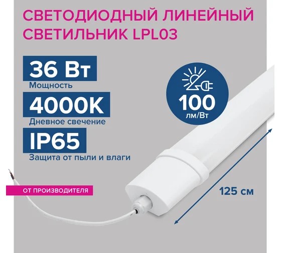 Светодиодный светильник LPL36-4K120-03 Lumin’arte 36 Вт, 4000К Дневной свет , IP65 , 3600лм , матовый – подойдет для использования в помещениях, где требуется яркое освещение и защита от пыли и влаги (IP65). Например, на заводах, складах или логистических центрах, а также на строительных площадках и погрузочных зонах, автомобильных паркингах или автосервисах.