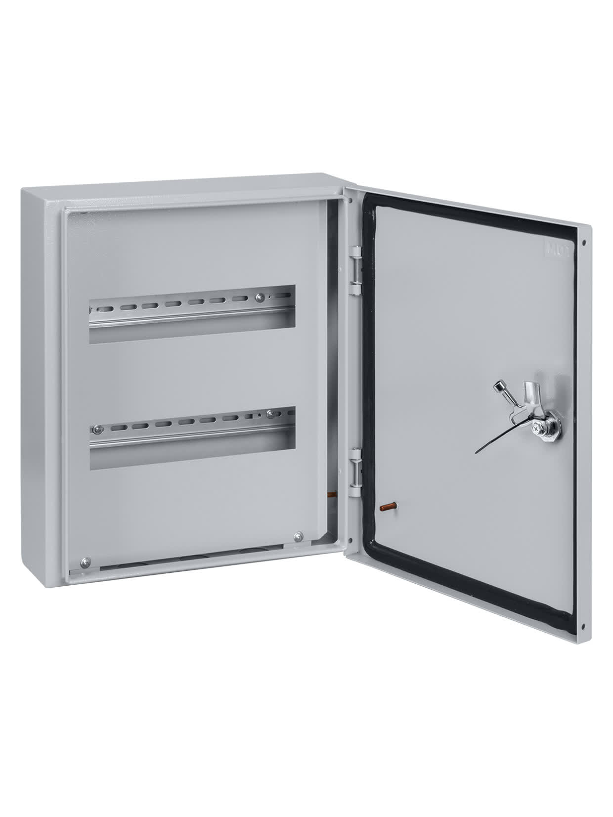 Щит распределительный навесной ЩРН-24 со степенью защиты IP66 позволяет разместить 24 стандартных модулей, 3 отверстия для ввода кабеля снизу, фальшпанель, исключающая доступ к токоведущим частям, DIN-рейка в комплекте.