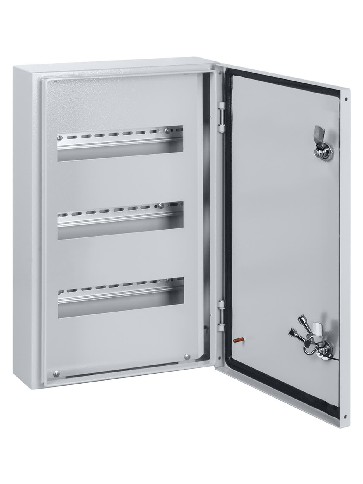 Щит распределительный навесной ЩРН-36 со степенью защиты IP66 позволяет разместить 36 стандартных модуля, 3 отверстия для ввода кабеля снизу, фальшпанель, исключающая доступ к токоведущим частям, DIN-рейка в комплекте.