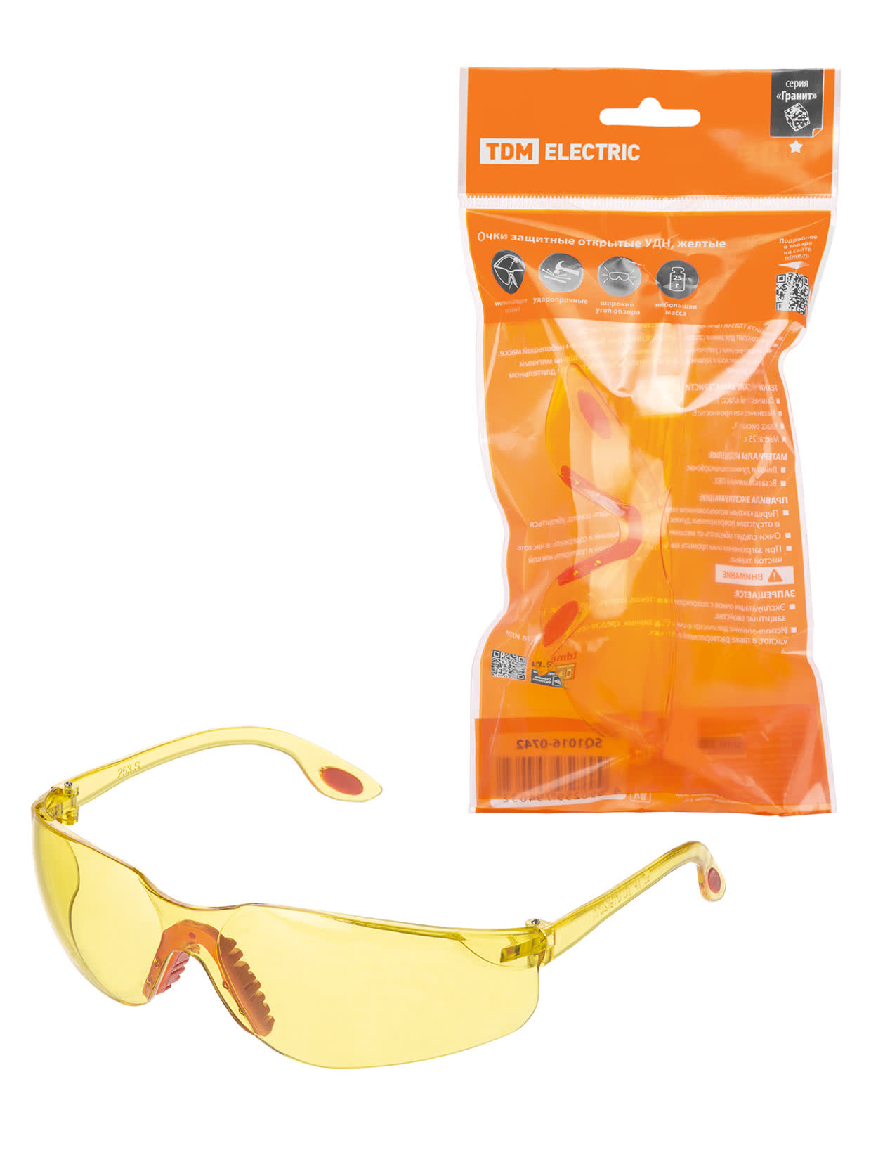 Очки защитные открытые ударопрочные, с дужками, с накладками на заушниках, желтые, “Гранит”, TDM